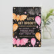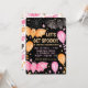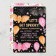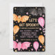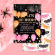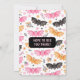 Um convite de festas de halloween, pastel fofo assustador, com morcegos fofinhos, balões, teias de aranhas e confetti em cor-de-rosa pastel e laranja num fundo preto. Personalize-o hoje mesmo! Consulte a coleção de partes correspondentes.