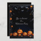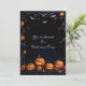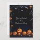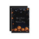 Os morcegos das cinzas pardas sobrevoam uma pilha de jack-o-lanternas em um fundo preto neste belo e divertido convite da festa do Dia das Bruxas. O dorso é preto sólido, com espaço para texto. Pode ser usado para crianças, adolescentes ou festas de adultos.