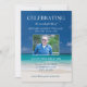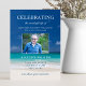 Convite à lembrança funerária que inclui um fundo oceânico de praia, uma foto da pessoa, e uma celebração azul de modelo de vida que é fácil de personalizar.