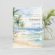 An elegant wedding invitation for a beach wedding, destination wedding. A watercolored sandy beach, ocean waves and palm trees as background.