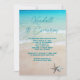 Casamento casual de praia, ou renovação de votos, convite com fontes modernas e modelos fáceis. A água verde azul do oceano e areia da praia com duas estrelas é a imagem de fundo do texto personalizado, mostrada em cartões 4x6 menores. Os primeiros nomes da noiva e do noivo estão em escrita à mão no topo. Todas as informações de cerimônia e recepção e RSVP (se desejar) são adicionadas no formulário de parágrafo. Forma fácil, barata e bonita de convidar a família e os amigos próximos a celebrar um evento especial.