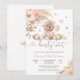 Celebrate your special day with this adorable bear-themed baby shower invitation featuring a sweet teddy bear holding balloons, surrounded by pastel florals, butterflies, and whimsical woodland accents. Perfect for honoring parents-to-be, this elegant design blends soft peach, pink, and beige tones for a warm and inviting look. Customize with your event details to create a memorable keepsake that guests will cherish. Ideal for baby showers, gender reveal parties, and milestone celebrations.