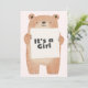 Bem-vinda a sua menina com este adorável convite de chá de fraldas com uma ilustração de urso doce segurando um cartaz que diz "É uma Menina." O verso inclui os detalhes do evento com um fundo cor-de-rosa macio e um título com tema de urso lúcido. Perfeito para florestas ou chás de fraldas de animais com um toque feminino!