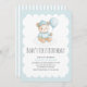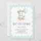 Esta design apresenta um aniversário de ursos de pré-disquete, chamado "Primeiro Aniversário do Urso", com um ursinho de pelúcia bonitinho em roupas de bebê azul pastel, um balão em sua mão sentado em uma nuvem fofa, bordas escalpadas e fundos azuis e brancos riscados. Perfeito para a primeira festa de aniversário de um bebê. Este produto pode ser facilmente personalizado.