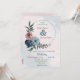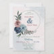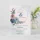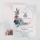 Beautiful botanical wedding invitation featuring pink, dusty blue and navy blue flowers with green leaves on a green circle forming a pretty romantic wreath.