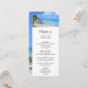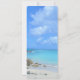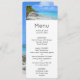 Menu card with a scenic tropical photograph. A secluded beach with white sand and turquoise water.