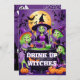 Levantem os óculos e se preparem para uma noite mágica com este "Beba Bruxas!" brincalhão! Convite para festa de Halloween. Apresentando bruxas de desenho animado reunidas em volta de um caldeirão borbulhante, rindo e segurando cocktails, esta design dá um tom alegre e iluminado para o seu evento. As cores vibrantes do roxo e do verde, combinadas com uma tipografia ousada e divertida, tornam-na perfeita para uma noite de meninas ou qualquer festa de Halloween que seja sobre humor e bons tempos. Traga a diversão para suas comemorações de Halloween com este convite espirituoso!