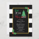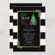 Coma, beba e seja feliz chá de panela de Natal com uma árvore de Natal e presentes contra uma estrutura de ouro. Fundo listrado a preto e branco com holocre