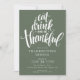 Celebre o Dia de Ação de Graças com seus entes queridos com este na moda e um convite elegante. O convite apresenta uma letra branca de caligrafia com o ditado "coma, beba e seja grato" definido em um fundo verde da floresta. A maneira perfeita de convidar seus convidados para uma noite memorável de comida, diversão e palhaçada.