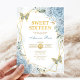 O convite perfeito para o doce 16 da sua filha está finalmente aqui! Este convite apresenta elegantes rosas azuis empoeirados de cor d'água, borboletas doces e estrutura geométrica de ouro moderna. Clique no botão "personalizar mais" se quiser reorganizar e formatar o estilo e a posição do texto.
