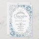 Convite para comemoração de Quinceanera, azul e prata. Recursos, fontes de script, borboletas prateadas, rosas de aquarela e tiara. Perfeito para uma elegante celebração de glam estilo princesa. Personalize com seus próprios detalhes. Impressos convites Zazzle ou modelo de impressão digital instantânea para download.