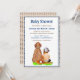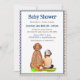 O Brown e o Blue personalizaram os convites para o chá de bebê com um bebê sentado ao lado de um cão com um tema de baseball.