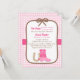 Sim! Este convite elegante, clássico e na moda em tons de cor-de-rosa e marrom é mais adequado para um tema de chá de fraldas ocidental e texano para a mamãe ser! Os principais elementos da design incluem uma bela bota de vaca, uma ferradura, uma borda de corda e um padrão de gingham cor-de-rosa. Personalize com detalhes da parte entre o espaço disponível.