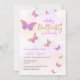 Uma borboleta bebê está no caminho do convite para Chás de fraldas de borboletas com lindas borboletas roxas de ouro rosa e tipo de caligrafia de script.