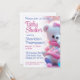 Um lindo ursinho branco está comendo doce rosa e azul neste belo chá de fraldas. Cores cor-de-rosa e azul fazem deste o convite de festas perfeito para o chá de fraldas, quer o bebê seja um menino ou uma menina, gêmeos, trigêmeos, ou o gênero ainda não foi revelado.