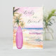 Um convite elegante para um Chá de fraldas, celebrando uma menina. Um pôr do sol cor-de-rosa, praia arenosa, ondas oceânicas e palmeiras como fundo, e um prato de surfe rosa e branco na praia.