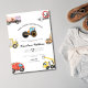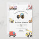 Este convite para chá de fraldas "Truck Baby under Construction" apresenta um caminhão central de construção, rodeado por caminhões mais pequenos e elementos de construção como cones e chapéus de duro. É uma design divertida e vibrante para celebrar a chegada do pequeno!