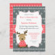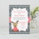 Adorável veado bebê vestindo um suéter de malha vermelha cercado por um quadro temido de inverno de flocos de neve e pinheiros. Um convite neutro para bebês asperspicazes, adequado para qualquer chá de fraldas, 3º, etc. durante os meses de inverno.