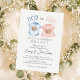 Duas roupas de bebê confortáveis, uma azul, uma rosa, cada uma com um rosto de urso doce, estão flutuando gentilmente através deste convite, fazendo a pergunta mais excitante: "Menino ou Menina?" Abaixo, o escrevendo japonês com símbolos kanji adiciona um toque cultural significativo e adorável. Matizes suaves e ilustrações lúcidas de ursos fazem disso uma escolha perfeita para famílias que querem um design que seja quente, gentil e cheio de charme. Que abraços de urso ajudem a anunciar sua alegria! Sugestões e suavidade do Japão, Junko 🐻 ✨