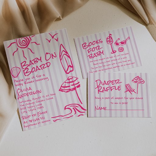Se você está procurando um convite de chá de bebê feminino de verão único, elegante e fácil de editar, este é perfeito para você. Como você vê, apresenta um script manuscrito rosa com bebê a bordo caprichoso em listras rosa claro. E prancha de surf desenhada à mão, sol, ondas de praia e pássaros voando. Com todas as informações que podem ser personalizadas facilmente clicando no botão personalizar. Este convite de chá de bebê moderno e único também é um e-convite virtual digital se você quiser enviá-lo por e-mail ou mensagem de texto. Então pegue-o e faça com que seus convites sejam verdadeiramente envolventes.