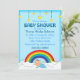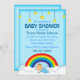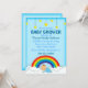 Um adorável convite de Chá de fraldas azul com um design digital de um bebê dormindo sob um arco-íris se abraçando em algumas nuvens muito macios. Acima dele, pendura algumas bonito estrelas amarelas. Você pode personalizar todo o texto com a sua própria escolha de palavras ou cores, então por favor sinta-se livre para isso.