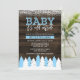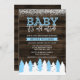 Convites temáticos do chá de fraldas do inverno rústico. Características deste design na moda uma floresta da neve com as árvores no branco e na luz - azul em um fundo de madeira escuro. Um toque moderno é adicionado com a pia batismal do roteiro do divertimento que diz o "bebê que é parte externa fria."