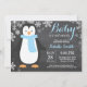 Bebê é Frio Fora do Convite para Chá de fraldas do Menino Pinguim. Convite para Chás de fraldas. Pinguim bebê. Convite para Chá de fraldas de férias de inverno. Flocos de neve azuis e brancos. Fundo Chalkboard. Para mais personalização, clique no botão "Personalizar" e use nossa ferramenta de design para modificar este modelo.