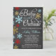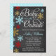 Adoráveis convites para bebês com tema de inverno. Apresentando uma fonte de script com a frase "Baby It's Fold Outside", com flocos de neve azuis, vermelhos e dourados em um design de fundo de quadro de quadro de chanfro. Moderno e fofo para um chá de fraldas.