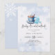 Chá de fraldas de inverno de menino azul bonito com flocos de neve, cacau quente, garrafa de bebê e pacificador.