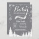 Bebê é o convite do Chá de fraldas Frio Fora do Inverno. Floco de neve branco. Convite para Chás de fraldas de Menino ou Menina. Convite para Chá de fraldas de férias de inverno. Fundo das cinzas. Montanha Florestal de Árvores Woodland. Para mais personalização, clique no botão "Personalizar" e use nossa ferramenta de design para modificar este modelo.