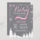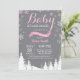 Bebê é o convite do Chá de fraldas Frio Fora do Inverno. Floco de neve rosa e branco. Convite para Chás de fraldas. Convite para Chá de fraldas de férias de inverno. Fundo das cinzas. Montanha Florestal de Árvores Woodland. Para mais personalização, clique no botão "Personalizar" e use nossa ferramenta de design para modificar este modelo.