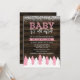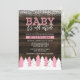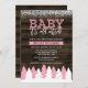 Pink russo e inverno branco convidadas para chuveiros de bebês. Esta moda design apresenta uma floresta de neve com árvores sobre um fundo de madeira escura. Um toque moderno é adicionado com uma fonte divertida de script dizendo "Querida, está frio lá fora."