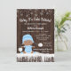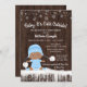 Meninos no inverno bebês fazem convites com um adorável bebê étnico vestindo uma roupa azul de neve bebê com chapéu numa madeira rústica e fundo de neve. Estes bonitos convites para o chá de bebê com floco de neve de inverno são facilmente personalizados para o seu evento simplesmente adicionando os seus detalhes. Este design funciona bem para um floco de neve ou gênero de inverno revela convite.