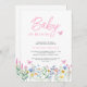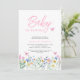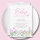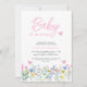 Você está planejando um chá de fraldas exclusivo? Este charmoso convite floral inclui flores silvestres e borboletas. Sua tipografia na moda cor-de-rosa lê "Baby in Bloom." Facilmente personalizável. Original Watercolor © Michele Davies.