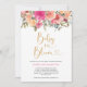 Estes convites para chuveiros de bebês apresentam um design botânico a aquarela com coral e rosas vermelhas cor-de-rosa, folhas, folhagem e moderna letra de escrita cardíaca a brilho dourado. Personalize-os com o seu texto.