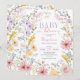 Celebre novos começos da maneira mais bonita com este convite de chá de bebê Baby in Bloom, apresentando uma moldura floral em aquarela suave e uma paleta fresca e romântica. Flores silvestres delicadas em rosa beije, lavanda, amarelo manteiga e azul suave rodeiam uma tipografia elegante, criando um design leve e arejado que se sente alegre, feminino e atemporal. Perfeito para chá de bebê na primavera e no verão, encontros no jardim ou celebrações com tema floral, este convite captura a beleza das flores em plena estação, ao mesmo tempo em que estabelece um tom caloroso e acolhedor para homenagear a futura mamãe.