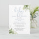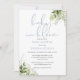 Um convite elegante, na moda, chá de fraldas, com tipografia azul elegante e empoeirada e bonito folhagem botânica. Projetado por Thisnotme©