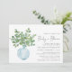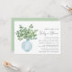 Este brilhante e alegre convite para chás de fraldas neutro em termos de gênero apresenta uma ilustração em aquarela do eucalipto verde sábio em um vaso de vidro azul e "Baby in Bloom" escrito em um roteiro de na moda. Adicione o nome da futura mãe e os detalhes do chá em uma simples tipografia moderna.