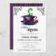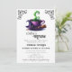 Baby Is Brewing Witch Coffee Halloween Invitation - Um simples e mínimo chá de fraldas assustador convida perfeito para um chá de fraldas de Halloween ou para o Bebê Sprinkle de outubro. Apresentando uma xícara de café quente com tema bruxa em cores brutas clássicas de verde, roxo e preto com um chapéu de bruxa e sotaques de vassoura-bruxa com moldura de rolagem vintage nos cantos superiores. Fontes assustadoras e afligidas acrescentam ao sentimento de Halloween deste convite de chá de fraldas. Personalize este modelo de convite para o chá de fraldas de Halloween editável com seus próprios detalhes de evento. Disponível como um modelo imprimível para download, envie-o facilmente via texto ou mídia social.