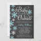 Adoráveis convites para bebês com tema de inverno. Apresentando uma fonte de script com a frase "Baby It's Cold Outside", com flocos de neve azuis e brancos em um design de fundo de quadro de quadro de chanfro. Moderno e fofo para um chá de fraldas.
