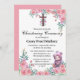 Explore a minha 'Criança Floral Rosa Cinzenta Cristening/Baptism Invitation', que mostra um belo design floral de aquarelas com uma menina num suéter cor-de-rosa, adornada com uma cruz no topo para simbolizar o batizado. Este modelo é perfeitamente personalizável para torná-lo exclusivamente seu.