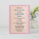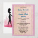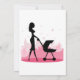 Um convite de chuvada de bebê azul turquesa. O fundo é um padrão desbotado de pequenas pegadas de bebê rosa. A parte traseira tem uma mamãe fashionista empurrando seu carrinho de bebê enquanto se aventura na cidade. Personalize com todos os detalhes da sua festa.