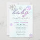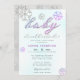 Modelo de convite de festas simples, moderno, elegante e chico, com fundo branco e azul texturizado, a palavra BABY coberta de rochas (não rochas reais, este é um efeito digital) com matiz roxa e rosa, e em roteiros modernos, tipografia moderna e alguns rotineiros cobriam flocos de neve, alguns deles cor-de-rosa e roxo. Uma design chic, eterno para uma futura mamãe que comemora seu chá de fraldas nos meses de inverno, novembro, dezembro ou janeiro ou mesmo além, enquanto houver neve!