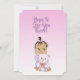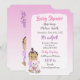 Convites de chá de bebê de bebê hispânica ou afro-americana com ursinho de pelúcia com fundo roxo e rosa.