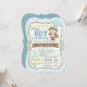 É um menino! Macaco-bebê castanho-bonito, tema animal da selva convite para chá de fraldas de menino azul-pastel e padrão retro-roxo branco. Possui macaco com balão e chapéu de festas e bolo azul pastel, amarelo e verde com bandeiras amarelas de bunting e fita marrom. Excelente para chás de fraldas temáticos da selva, zoológico ou safari. Convite em forma de colchete de safra.