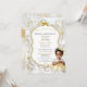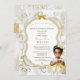Menina de vestido branco e dourado. O fundo do convite é o cetim branco, o filigre dourado, uma moldura dourada e prateada e um embelezamento do arco. A parte de trás é enfeitada com padrão de flores douradas e fita dourada sobre fundo branco de cetim.