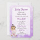 Convites de chá de bebê de Bebê Menina Hispânica ou Afro-Americana com Urso de Pelúcia com fundo roxo.