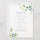 Um convite para chá de fraldas elegante e moderno, rapaz, rústico "Bebê em Sangue", com um quadro floral de cor aquosa de anêmonas brancas, flores de preenchimento e folhagem em um arranjo floral doce. Este elegante, rústico, chá de fraldas de menino também apresenta caligrafia romântica e moderna com fartas flores e azul-bebê na cor do dorso.