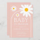 Você está planejando um chá de fraldas de menina? Este encantador convite é decorado com margaridas desenhadas à mão num fundo de arco rosa. Diz "Baby in Bloom" na tipografia da na moda. Facilmente personalizável. Desenho original © Michele Davies.