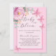 Um fundo rosa com um arco. Decorados com um verde-floral, rosa, de cor verde, verde-aquoso de eucalipto e borboletas. Personalize e adicione o nome da mãe a ser e os detalhes da festa. Texto: Bebê em Bloom
